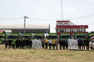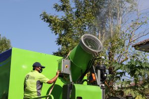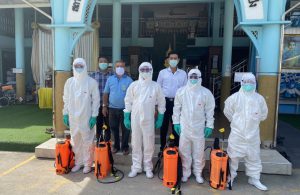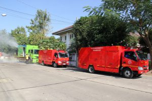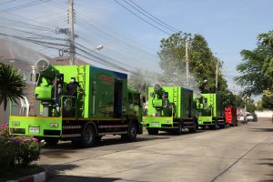 หอการค้าจังหวัดสมุทรปราการ ร่วมกับ องค์การบริหารส่วนจังหวัดสมุทรปราการ นำรถตัวหนอน และรถเทลเลอร์ PM 2.5 ฉีดพ่นน้ำยาฆ่าเชื้อไวรัสโควิด-19 ในเขตพื้นที่ ตำบลบางเมือง และตำบลบางเมืองใหม่