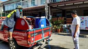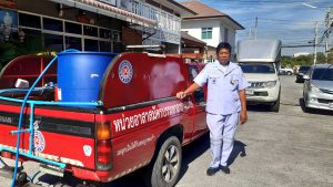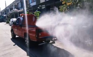 (ผู้ใหญ่เชาว์) และหน่วยบรรเทา อาสาสมัครมูลนิธิร่วมกุศล สมุทรปราการ ฉีดพ่นยาฆ่าเชื้อไวรัสโควิด- 19 ภายในชุมชนหมู่บ้านทรัพย์รุ่งเรืองซิตี้