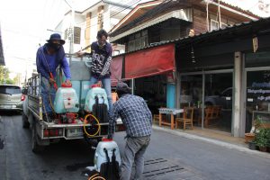 ผู้ใหญ่กบ นำทีมลุยฉีดพ่นยาฆ่าเชื้อโรคและแบคทีเรีย ภายในวัดพุทธภาวนาราม และตามซอยต่างๆ ที่รถพ่นไอ้น้ำแรงดันสูงไม่สามารถเข้าได้ เพื่อยับยั้งการแพร่ระบาดของโรคติดเชื้อไวรัสโควิด-19