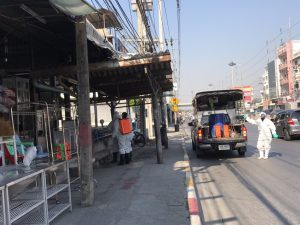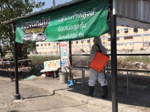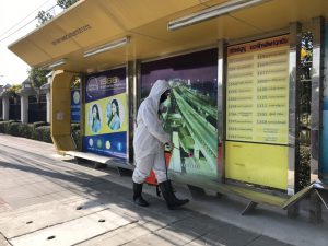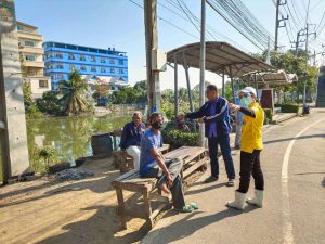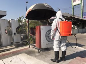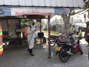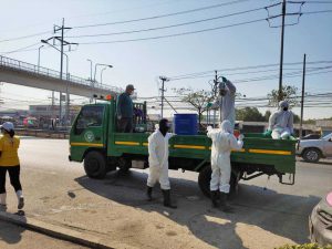เทศบาลตำบลบางปู ฉีดพ่นน้ำยาฆ่าเชื้อ ในเขตพื้นที่เสี่ยงที่มีประชาชนใช้บริการจำนวนมาก