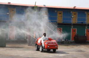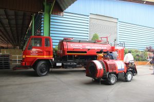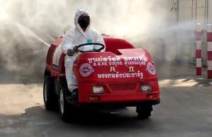 “เฮียเอี๋ยว” ประธานบริหาร บริษัท โคมอส คอร์ปอเรชั่น จำกัด ตระหนักถึงความปลอดภัยของพนักงาน และส่วนรวม นำรถตัวหนอนพ่นไอน้ำ ฉีดพ่นน้ำยาฆ่าเชื้อโรคและแบคทีเรีย ภายในโรงงาน