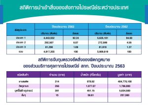 สำหรับ สถิติการน าเข้าสิ่งของส่งทางไปรษณีย์ระหว่างประเทศ ในปีงบประมาณ 2562 มีทั้งหมด 5,989,619 หีบห่อ ในปีงบประมาณ 2563 มีทั้งหมด 4,817,355 หีบห่อ ด้านสถิติการจับกุมตรวจยึด สิ่งของผิดกฎหมาย ของส่วนบริการศุลกากรไปรษณีย์ สำนักงานศุลกากรกรุงเทพ ปีงบประมาณ 2563 มีดังนี้ ยาเสพติด จ านวน 214 ราย น้ำหนัก 978.92 กิโลกรัม มูลค่า 404,770,100 บาท วัตถุลามก จ านวน 356 ราย น้ำหนัก 1,077.87 กิโลกรัม มูลค่า 1,796,000 บาท บุหรี่ไฟฟ้าพร้อมอุปกรณ์ จำนวน 391 ราย น้ำหนัก 451.15 กิโลกรัม มูลค่า 257,300 บาท