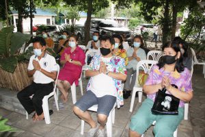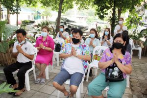 จากนั้น ครอบครัวไชยพัชรีกรณ์ พร้อมด้วย นางธนาวรรณ รุ่งเรือง ว่าที่สมาชิกสภาเทศบาลตำบลสำโรงเหนือ นายกฤต กิตติสัจจา (จิ๊ฟฟี่) นักธุรกิจนำเข้าเครื่องจักรกล แม่พิมพ์ชิ้นส่วนอีเล็คทรอนิกส์ นายสมชัย การบรรจง นางพรทิพย์ การบรรจง น.ส.รุ่งอรุณ แสงอารุง นายชัยยุทธ เรืองคำ ผู้อำนวยการตัวแทน (DOA) ภาคเหนือตอนล่าง ตลอดจน พนักงาน บริษัท อู่ เจ.เค.คาร์ เซอร์วิส (2016) จำกัด และสมาชิกกลุ่ม 80 ฅน ปากน้ำ ร่วมกันถวายภัตตาหารเช้า และจตุปัจจัยไทยธรรม แด่พระภิกษุสงฆ์ พระสงฆ์ให้ศีล กรวดน้ำ รับพร ประพรมน้ำพระพุทธมนต์ เพื่อความเป็นสิริมงคล