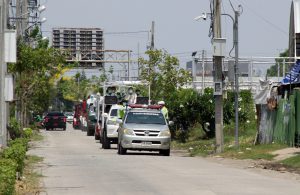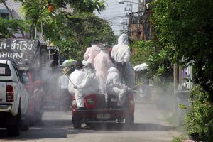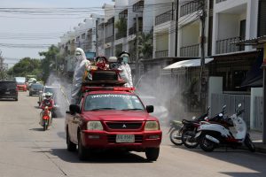 อบจ.สมุทรปราการ และหอการค้าจังหวัดสมุทรปราการ ประสานความร่วมมือกับเทศบาลตำบลเทพารักษ์ นำรถตัวหนอนฉีดพ่นน้ำยาฆ่าเชื้อโควิด-19 ในเขตพื้นที่ตำบลเทพารักษ์