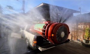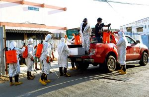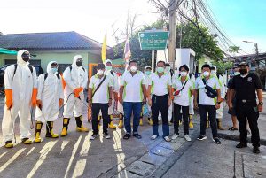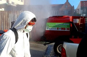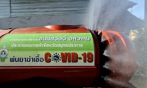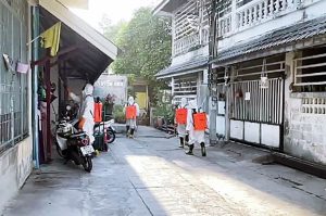 ประธานหอการค้าจังหวัดสมุทรปราการ ร่วมกับ เทศบาลนครสมุทรปราการ จัดกำลังเจ้าหน้าที่เดินเท้าฉีดพ่นน้ำยาฆ่าเชื้อภายในชุมชน อย่างต่อเนื่องด้วยความห่วงใย