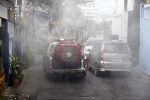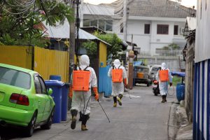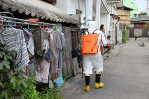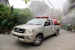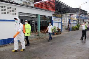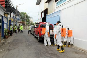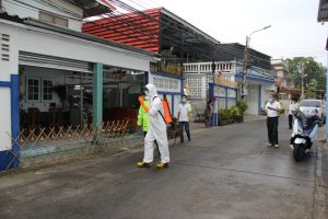 รองนายกเทศมนตรีนครสมุทรปราการ นำรถแอร์บัสขนาด 400 ลิตร และเจ้าหน้าที่ชุดเดินเท้า ฉีดพ่นน้ำยาฆ่าเชื้อไวรัส ภายในชุมชนสายลวดซอย 4