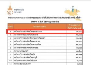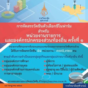 ‘จัดสรรวัคซีนตัวเลือกซิโนฟาร์ม ระยะที่ 1 สำหรับหน่วยงานองค์กรปกครองส่วนท้องถิ่น (อปท.) ครั้งที่ 1 ทั้งนี้ หน่วยงานที่ส่งเอกสารแจ้งแผนการจัดลำดับกลุ่มการกระจายวัคซีนให้กับประชาชนในท้องถิ่นตาม Format Form ของราชวิทยาลัยจุฬาภรณ์ เข้ามาครบถ้วนสมบูรณ์ จำนวน 69 หน่วยงาน’