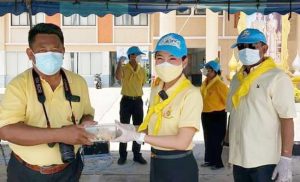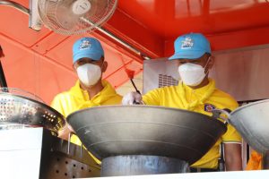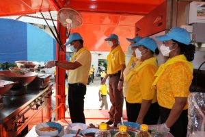 ด้าน นายจารุวัฒน์ วงศ์จอม นายอำเภอพระสมุทรเจดีย์ กล่าวว่าในพื้นที่อำเภอพระสมุทรเจดีย์ทั้ง 5 ตำบล ของอำเภพระสมุทรเจดีย์ อาทิ ตำบลในคลองบางปลากด ตำบลปากคลองบางปลากด ตำบลแหลมฟ้าผ่า ตำบลบ้านคลองสวนและตำบลนาเกลือ พบผู้ติดเชื้อหลายหมู่บ้านแล้วตั้ งแต่เกิดการระบาดตั้งแต่ช่วงต้นปี 2564 เป็นต้นมา และพบผู้ป่วยติดเชื้อในพื้นที่อีกเป็นจำนวนมากทำให้การดำรงชีวิตของประชาชนในพื้นที่ดำเนินการไปด้วยความยากลำบาก ดังนั้นเพื่อเป็นการบรรเทาทุกข์และช่วยเหลือในเบื้องต้นจึงได้ประสานขอรถโรงครัวเลื่อนที่จากกรมป้องกันและบรรเทาสาธารณภัยเขต 1 จังหวัดปทุมธานี โดยผ่านทางสำนักป้องกันและบรรเทาสาธารณภัยจังหวัดสมุทรปราการออกหน่วยโรงครัวเคลื่อนที่จัดปรุงอาหารสำเร็จรูปอาทิ ไก่ทอด ผัดคั่วกลิ่ง ไข่ต้ม ข้าวสวย ผัดซีอิ้ว พร้อมน้ำดื่ม บรรจุเป็นชุดออกแจกจ่ายให้กับประชาชนในพื้นที่จำนวน 600 คน พร้อมทั้งยังได้ประชาสัมพันธ์ถึงกำหนดมาตรการ ให้ประชาชาชนได้ปฏิบัติตามข้อแนะนำ เช่น เว้นระยะห่าง สวมหน้ากากอนามัย หมั่นล้างมือ กลุ่มเสี่ยงให้กักตัวเองที่บ้านสังเกตอาการ 14 วัน ทั้งนี้หากได้รับความร่วมจากประชาชนในพื้นที่อำเภอพระสมุทรเจดีย์ตามมาตรการของกระทรวงสาธารณสุขออย่างเคร่งครัดคาดว่าจะสามารรถควบคุมการแพร่ระบาดของเชื้อโควิด 19 ในพื้นที่ได้ดังกล่าว