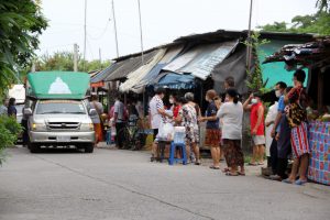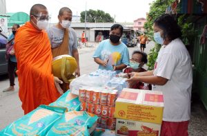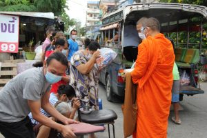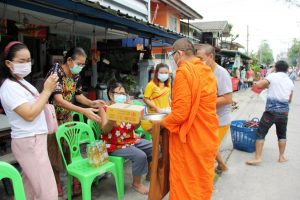 เจ้าอาวาสวัดศรีจันทร์ประดิษฐ์ เดินบิณฑบาต ข้าวสาร อาหารสำเร็จรูป ช่วยเหลือชาวบ้านที่ได้รับผลกระทบจาก โควิด-19