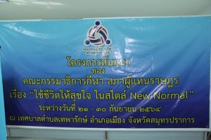โดยคณะกรรมาธิการกีฬาสภาผู้แทนราษฎร โดย นางสาวภริม พูลเจริญ สมาชิกสภาผู้แทนราษฎร เขต 3 จังหวัดสมุทรปราการ ในฐานะคณะกรรมาธิการกีฬา สภาผู้แทนราษฎรประธานเปิดโครงการสัมมนา เรื่อง”ใช้ชีวิตให้สุขใจ ในสไตล์ New Normal”ระหว่างวันที่ 21-30 กันยายน 2564 และนายวชิรเชษฐ รุ่งธวัฒน์วงศ์ นายกเทศมนตรีตำบลเทพารักษ์ ให้เกียรติเป็นประธานปิดการสัมมนา พร้อมมีนางภรภัทร พูลเจริญ นายสมศักดิ์ เอี่ยมสอาด สมาชิกสภาองค์การบริหารส่วนจังหวัดสมุทรปราการ นายชาตรี อยู่วัฒนะ รองนายกเทศมนตรีตำบลเทพารักษ์ นายสุนทร ฉ่ำชื่น ประธานสภาเทศบาลตำบลเทพารักษ์ นายธนะสิทธิ์ วงษ์แก้วบุญเรือน รองประธานสภาเทศบาลตำบลเทพารักษ์ ดร.อภิชาติ กิตติศักดิ์นาวิน ที่ปรึกษานายกเทศมนตรีตำบลเทพารักษ์ และสมาชิกสภาเทศบาลตำบลเทพารักษ์ ผู้เข้ารับการสัมมนา คณะครู ผู้นำชุมชน อสม.และประชาชนทั่วไป จำนวน 400 คน แบ่งเป็นรุ่นๆละ 25 คน จำนวน 16 รุ่น วัตถุประสงค์เพื่อให้ผู้ที่เข้ารับการสัมมนาทราบถึง คุณภาพของกล้ามเนื้อ ระบบทางลมหายใจได้มาตรฐานในระหว่างการออกกำลังกายหรือไม่ กายภาพทางร่างกายได้สัดส่วนตามมาตรฐานหรือไม่ สามารถออกกำลังกายปรับกายภาพให้ได้ตามสัดส่วน ทำให้ร่างกายมีระบบความเป็นสมดุลสุขภาพดี แบบง่ายๆ และนำไปถ่ายทอดให้ผู้อื่นนำปฎิบัติได้ด้วย