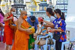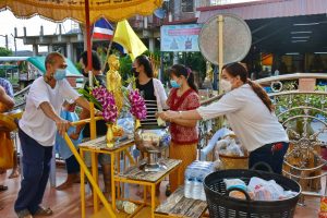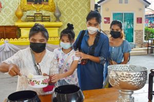 บรรยากาศทำบุญวันออกพรรษา New Normal ของวัดศรีจันทร์ประดิษฐ์ หยุดติดต่อกัน 4 วัน ประชาชนพาครอบครัวเข้าวัดคึกคัก