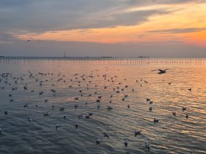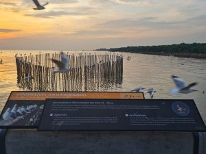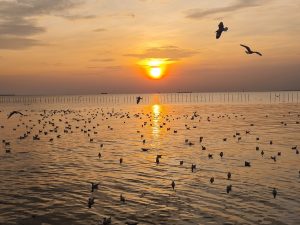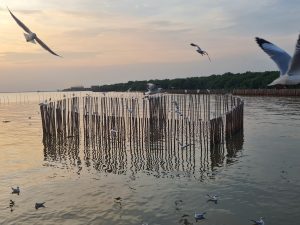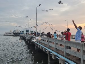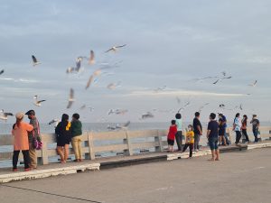 บรรยากาศนักท่องเที่ยวพักผ่อนชมนกนางนวลบนสะพานสุขตา สถานตากอากาศบางปู ซึ่งในแต่ละปีจะมีนก อพยพมาให้ได้ชมและให้อาหารกันอย่างใกล้ชิด ตั้งแต่ช่วงปลายปี ไปจนถึงช่วงเดือนพฤษภาคม