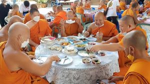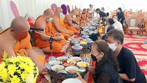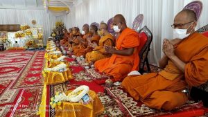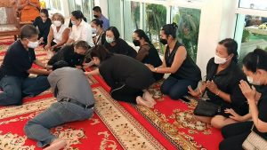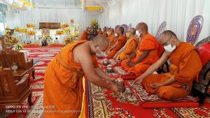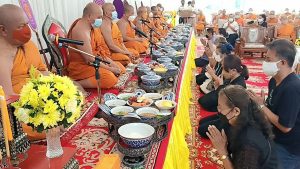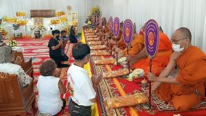 คณะพระภิกษุสงฆ์ คณะกรรมการ ไวยาวักกร วัดบางนางเกรง ครอบครัวสืบสำราญ และครอบครัวศรสังข์ทอง ประกอบพิธีสวดพระพุทธมนต์ เนื่องในงานทำบุญ 7 วัน (สัตตมวาร) พระปลัดเล็ก ปภาโส (ปั่นทอง) อดีตเจ้าอาวาสวัดบางนางเกรง