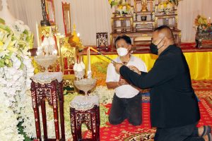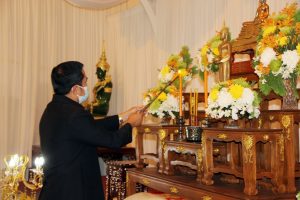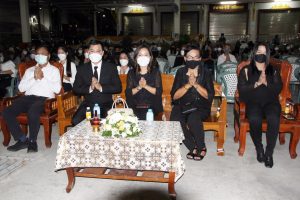 โดยมี ท่านพระครูวิมลศุภการ , ดร.(สัมฤทธิ์ สวนมาลี) เจ้าคณะอำเภอ เจ้าอาวาสวัดด่านสำโรง พระครูพุทธิสารโสภิต ที่ปรึกษาเจ้าคณะอำเภอ เจ้าอาวาสวัดบางโปรง และพระครูวินัยธรไมตรี ฐตเปโม รักษาการแทนเจ้าอาวาสวัดบางนางเกรง นำคณะพระภิกษุสงฆ์ ร่วมในพิธี พร้อมด้วย คณะผู้บริหาร คณะกรรมการ สมาชิกสมาคมชาวใต้สมุทรปราการ คณะกรรมการสารทเดือนสิบ ครอบครัวสืบสำราญ ครอบครัวศรสังข์ทองตลอดจน ตัวแทนจากกลุ่มชมรมชาวใต้ต่างๆ และเหล่าบรรดาศิษยานุศิษย์ จำนวนมาก ต่างเดินทางมาร่วม แสดงความเคารพและไว้อาลัยเป็นครั้งสุดท้าย บรรยากาศเป็นไปด้วยความโศกเศร้า โดยมี ไวยาวัจกรครอบครัวสืบสำราญ และครอบครัวศรสังข์ทอง ร่วมให้การต้อยรับ ภายใต้การอำนวยความสะดวกของเจ้าหน้าที่ อสม. มาตั้งจุดรคัดกรองเพื่อป้องกันการแพร่ระบาดของโรคติดต่อเชื้อไวรัส โควิด-19