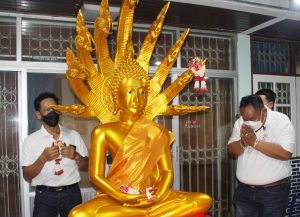 เมื่อเวลา 17.00 น.ของวันที่ 5 มี.ค.65 ที่ บ้านเลขที่ 80/791โครงการบ้านทิพวัล 1 ซ.ทิพวัล 55 หมู่ 5 ถ.เทพารักษ์ ต.บางเมืองใหม่ อ.เมืองฯ จ.สมุทรปราการ ครอบครัวหวังสมนึก นำโดย นายสมชาย หวังสมนึก ผู้ช่วยผู้ใหญ่บ้านหมู่ 5 ต.บางเมืองใหม่ พร้อมด้วย นางชนิดาพร หวังสมนึก นางชลลดา นายกษิติ์เดช วังวราวุธ และนางพารี หวังสมนึก ประธานชุมชนทิพวัล 3 ศิษยานุศิษย์ องค์ปู่ท้าวเวสสุวรรณ จัดพิธีสวดมนต์เย็น เจริญจิตภาวนา ประกอบพิธีเบิกเนตร “พระนาคปรก” ขนาดหน้าตัก 40 นิ้ว สูง 2 เมตร 55 ซม.โดยครอบครัวหวังสมนึก ได้ตั้งจิตรอธิษฐานว่า หากประสบความสำเร็จในด้านการทำธุรกิจรับเหมาก่อสร้างและต่อเติม ภายใต้ชื่อ บริษัท 791 คอนสตรัคชั่น จำกัด จะจัดสร้าง “พระนาคปรก” พระประจำวันเกิด วันเสาร์ ซึ่งเป็นพระพุทธรูปในพระอริยาบถประทับขัดสมาธิ บนบัลลังก์พญานาคแผ่พังพานปกเหนือพระเศียร อุทิศให้ นายสมพันธ์ หวังสมนึก ถวาย ณ วัดจำปุย ตำบลบ้านดง อำเภอแม่เมาะ จังหวัดลำปาง มี พระอาจารย์เสาร์ ธนปาโล เป็นเจ้าอาวาส