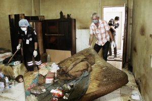 เมื่อเจ้าหน้าที่มูลนิธิร่วมกุศล สมุทรปราการ มาถึงบริเวณห้องดังกล่าว ถึงกับผงะ สภาพชีวิตความเป็นอยู่ภายในห้องพัก มีแต่ข้าวของเครื่องใช้ที่พุพังแล้ว รวมทั้งเศษขยะและขี้แมวที่หมักหมมไว้นาน จนส่งกลิ่นเหม็นไปทั่ว จึงดำเนินการช่วยเหลือ ร่วมกับ ทีมแม่บ้าน โครงการเจริญสินธานี บางปูนคร ทำความสะอาดภายในห้องพัก นำข้าวของเครื่องใช้ที่พุพังแล้วภายในห้องทิ้งทั้งหมด ก่อนนำตัวนายมนตรี พวงสำลี อายุ 65 ปี ลูกชายของคุณยายเฉลียว พวงสำลี วัย 88 ปี อาบน้ำทำความสะอาดร่างกาย เปลี่ยนชุดที่นอน พัดลมตั้งโต๊ะให้ใหม่ รวมถึงมอบเงินจำนวน 2.000 บาท ตลอดจนเครื่องอุปโภค บริโภค แพมเพิส อาหารแมว และสิ่งของเครื่องใช่ที่จำเป็น อีกหลายรายการ ให้กับคุณยายเฉลียว อีกด้วย