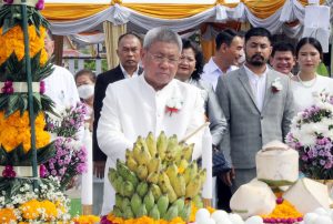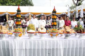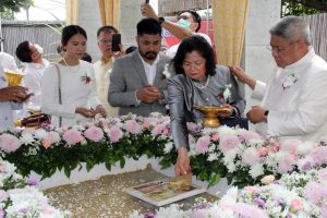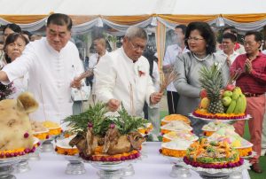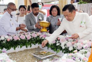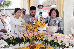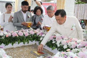หลังจากนั้น เข้าสู่พิธีปฐมฤกษ ประธานจัดสร้างฯ นายบัลลังก์ แตงอ่อน กล่าวรายงานถึงวัตถุประสงค์ของการจัดงาน โดยมี ผู้ว่าราชการจังหวัดสมุทรปราการ นายวันชัย คงเกษม ประธานกล่าวเปิดงาน ตอกเข็มมงคล 9 ต้น ตามลาดับเป็นประทักษิณ วางแผ่นอิฐทอง-นาก-เงินตามลาดับ วางตลับนพรัตน์ลงในช่องอิฐที่ก่อไว้แล้ววางศิลาฤกษ์ทับ โปรยข้าวตอกดอกไม้ เหรียญเงิน เหรียญทองลงในหลุม โดยได้รับความเมตตาจาก พระครูสถิตปุญญานุวัฒน์ (หลวงพ่อบุญเอิบ สุวณฺโณ) เจ้าอาวาสวัดราษฏร์นิยมธรรม (คลองสี่) ประพรมน้ำพระพุทธมนต์และโปรยทรายเสก โดยจะมีพิธีพุทธาภิเษก ขึ้นอีกครั้ง ในวันเสาร์ที่ 5 พฤศจิกายน 2565