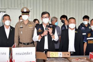 วันนี้ (7 ตุลาคม 2565) เวลา 14.30 น. นายพชร อนันตศิลป์ อธิบดีกรมศุลกากร แถลงข่าว ร่วมกับพล.ต.ต. อนันต์ นานาสมบัติ ผู้บังคับการปราบปรามการกระทำผิดเกี่ยวกับการคุ้มครองผู้บริโภค พ.ต.อ.เชษฐ์พันธ์ กิติเจริญศักดิ์ ผู้กำกับการ 1 กองบังคับการปราบปรามการกระทำความผิดเกี่ยวกับการคุ้มครองผู้บริโภค และนายสัตวแพทย์ชัยวัฒน์ โยธคล รองอธิบดีกรมปศุสัตว์ รักษาราชการอธิบดีกรมปศุสัตว์ ร่วมกันทำการจับกุมเนื้อสุกรแช่แข็งลักลอบ เข้ามาในราชอาณาจักร โดยไม่ผ่านพิธีการศุลกากร มีเมืองกำเนิดอิตาลี สเปนและบราซิล น้ำหนักกว่า 100,000 กิโลกรัม มูลค่าประมาณ 21 ล้านบาท นอกจากนี้ ยังจับกุมขาไก่ มีถิ่นกำเนิดจากประเทศบราซิลและตรุกี 35,000 กิโลกรัม มูลค่าประมาณ 700,000 บาท ณ โกดังเลขที่ 44/1 และ 44/4 หมู่ 3 ต.นาดี อ.เมือง จ.สมุทรสาคร
