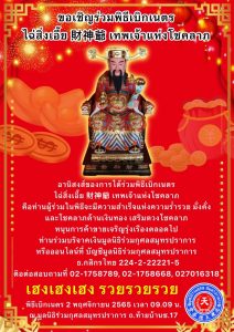 2 พ.ย.65 เวลา 09.09 น.ขอเชิญร่วมงานเบิกเนตร ไฉ่ซิ่งเอี้ย เทพเจ้าแห่งโชคลาภ และไท่ส่วยเอี้ย เทพเจ้าคุ้มครองดวงชะตา ณ มูลนิธิร่วมกุศล สมุทรปราการ 57/1 ซอย 11 ท้ายบ้าน ต.ปากน้ำ อ.เมืองสมุทรปราการ จ.สมุทรปราการ