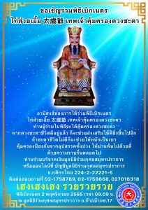 ขอเชิญร่วมงานเบิกเนตร ไฉ่ซิ่งเอี้ย เทพเจ้าแห่งโชคลาภ และไท่ส่วยเอี้ย เทพเจ้าคุ้มครองดวงชะตา ณ มูลนิธิร่วมกุศล สมุทรปราการ
