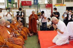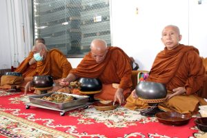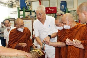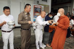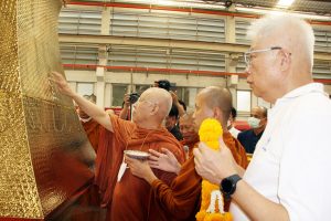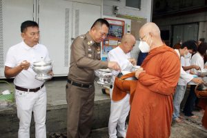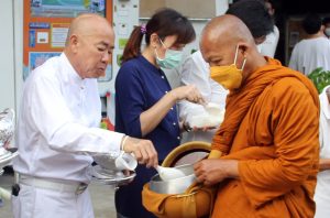 โดยมี นายขจรศักดิ์ จิรรัตน์จรัสธร กรรมการผู้จัดการ บริษัท ฐาปนินทร์ จำกัด กรรมการ กต.ตร.จังหวัดสมุทรปราการ ผู้จัดสร้าง มณฑป เป็นประธารฝ่ายฆราวาส พร้อมด้วย นายมนต์ชัย จิรรัตน์จรัสธร รองกรรมการผู้จัดการ บริษัท ฐาปนินทร์ จำกัด พล.ต.ต.พัลลภ แอร่มหล้า ผบก.ภ.จว.สมุทรปราการ “เฮียเอี๋ยว” สุดใจ จิรยาภากร ประธานที่ปรึกษา กต.ตร.จังหวัดสมุทรปราการ นายฉะโอด รุ่งเรือง อดีต นายก อบต.บางพลีใหญ่ คณะกรรมการ กต.ตร.จังหวัดสมุทรปราการ กต.ตร.สภ.บางพลี ตลอดจน ครอบครัวจิรรัตน์จรัสธร คณะผู้บริหารฯ พนักงานบริษัท ฐาปนินทร์ จำกัด และแขกผู้มีเกียรติ ร่วมกันตักบาตรข้าวสุกและอาหารแห้ง แด่พระเถรานุเถระ
