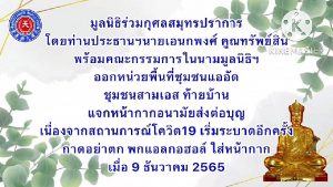 วันที่ 10 ธันวาคม 2565 มูลนิธิร่วมกุศลสมุทรปราการ นำโดย นายเอนกพงศ์ คูณทรัพย์สิน ประธานมูลนิธิร่วมกุศลสมุทรปราการ พร้อมด้วย คณะกรรมการมูลนิธิร่วมกุศล สมุทรปราการ และเจ้าหน้าที่ อาสาสมัครมูลนิธิร่วมกุศล สมุทรปราการ ลงพื้นที่แจกหน้ากากอนามัย ภายในชุมชนสามเอส ถนนท้ายบ้าน ตำบลท้ายบ้าน อำเภอเมือง จังวัดสมุทรปราการ พร้อมประชาสัมพันธ์ กาดอย่าตก พกแอลกอฮอล์ ใส่หน้ากากอนามัยทุกครั้งก่อนออกจากบ้าน ภายใต้โครงการหมื่นหน้ากากปันน้ำใจ สู้ภัยโควิด 19″ ไปกับมูลนิธิร่วมกุศล สมุทรปราการ