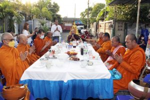 วันที่ 31 ธันวาคม 2565 เวลา 07.09 น. ที่ บริเวณหน้าที่ทำการผู้ใหญ่บ้านหมู่ 6 การเคหะชุมชนสมุทรปราการ ต.ท้ายบ้านใหม่ อ.เมืองฯ จ.สมุทรปราการ ผู้ใหญ่สมเกียรติ ทองเหลือ ผู้ใหญ่บ้าน หมู่ 6 ต.ท้ายบ้านใหม่ สท.ถนอมศรี ทองเหลือ สมาชิกสภาเทศบาลตำบลบางปู ผู้ช่วยสุภาพ รอดพงษ์ ผู้ช่วยสุนิษา โชติธนสุวรรณ์ ผู้ช่วยผู้ใหญ่บ้านหมู่ 6 ต.ท้ายบ้านใหม่ พร้อมด้วยคณะกรรมการหมู่บ้าน (กม.) และทีมงานกลุ่มรักษ์หมู่ 6 จัดพิธีทำบุญตักบาตรข้าวสาร อาหารแห้ง พระสงฆ์ จำนวน 9 รูป จากวัดโสธรนิมิตต์ นำโดย พระเดชพระคุณ (หลวงพ่อน้อย) พระครูโกศลพัฒนากร เจ้าอาวาสวัดโสธรนิมิตต์ ออกเดินรับบิณฑบาต โดยเริ่มจากเคหะชุมชน ซอย 7 ถึงตลาดการเคหะชุมชน สมุทรปราการ เนื่องในโอกาสส่งท้ายปีเก่าต้อนรับปีใหม่ 2566 และเพื่อถวายเป็นพระราชกุศล สมเด็จพระเจ้าลูกเธอ เจ้าฟ้าพัชรกิติยาภา นเรนทิราเทพยวดี กรมหลวงราชสาริณีสิริพัชร มหาวัชรราชธิดา ขอให้พระองค์ทรงหายจากพระอาการประชวรโดยเร็ววัน