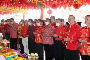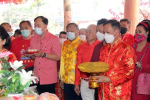 จากนั้น นายศุภมิตร ชิณศรี ผู้ว่าราชการจังหวัดสมุทรปราการ ได้กล่าวอวยพร แก่คณะกรรมการมูลนิธิร่วมกุศลสมุทรปราการ และสาธุชนทุกท่าน เพื่อความเป็นสิริมงคล โดยมี นายเอนกพงศ์ คูณทรัพย์สิน ประธานมูลนิธิร่วมกุศลสมุทรปราการ กล่าวคำอวยพรด้วยภาษาจีน และมอบส้มมงคลให้กับผู้ว่าราชการจังหวัดสมุทรปราการ ตลอดจนแขกผู้มีเกียรติ และคณะกรรมการมูลนิธิร่วมกุศล สมุทรปราการ โดยมี พ่อค้า ประชาชน และพุทธศาสนิกชน ชาวไทยเชื้อสายจีน เดินทางมากราบไหว้ขอพรองค์หลวงปู่ไต้ฮงกง ไหว้ขอพรฝากดวงชะตาเทพเจ้าไท่ส่วยเอี๊ย คุ้มครองดวงชะตา สุขภาพแข็งแรง บังเกิดลาภผล บุญวาสนาโชติช่วง โชคลาภเพิ่มพูน อยู่เย็นเป็นสุข ไหว้ขอพรเทพเจ้าไฉ่สิ่งเอี้ย เทพเจ้าแห่งโชคลาภ เงินตรา ร่ำรวย เงินทอง ตลอดจนทำบุญถวายประทีปโคมไฟจีน(เต็งลั้ง) ชีวิตสว่างไสวเจริญรุ่งเรืองตลอดปี ลงชื่อพะเก่ง สวดเสริมดวง ความครัวเป็นสุข สะเดาะห์เคราะห์ เสริมโชคลาภ เสริมชะตา ความมั่งคงถาวร นอกจากนี้ ทุกปีทางมูลนิธิร่วมกุศล สมุทรปราการ ยังมีการจัดเตรียมซุ้มอาหาร คาวหวาน และน้ำดื่ม ไว้คอยต้อนรับสาธุชนทุกท่าน อีกด้วย