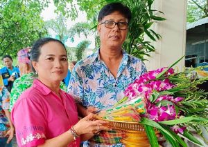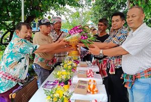 โดยมี นายไพรัตน์ จันทร์ไชยแก้ว นายกสมาคมชาวใต้สมุทรปราการ พร้อมด้วยคณะกรรมการ ที่ปรึกษา เลขานุการกลุ่มพี่น้องพ้องเพื่อน จากสมาคมฯ ชมรมฯ ต่างๆ ในเขตพื้นที่จังหวัดสมุทรปราการ และปริมณฑล ร่วมกันมอบของที่ระลึก เป็นชุด ผ้าขนหนู ผ้าขาวม้าและผ้าถุง ให้กับผู้สูงอายุทุกคนที่มาร่วมงาน นอกจากนี้ พระปลัดจารุ จารุธัมโม วัดบางนางเกรง และผญ.อรุณ บุญเพ็ชรทอง ยังได้มอบวัตถุมงคล หลวงปู่ทวดแห่งวัดบางนางเกรง ให้กับผู้ที่มาร่วมกิจกรรมสืบสานประเพณีวันสงกรานต์ ประจำปี 2566 เพื่อความเป็นสิริมงคล ท่ามกลางสายฝนที่โปรยลงมาอย่างชื่นฉ่ำ ทั้งนี้ ต้องขอบคุณพี่น้องพ้องเพื่อนชาวใต้สมุทรปราการ พระครูนันทพลาภิรม เจ้าอาวาสวัดเกร็ดแรด เจ้าคณะตำบลทุ่งใส เลขาเจ้าคณะอำเภอสิชล นครศรีฯ พระปลัดจารุ จารุธัมโม วัดบางนางเกรง พี่สุพร-เสี่ยชาญ-น้องเล็ก คุณกำพล สุจริตธุระการ ประธานจัดงานเดือนสิบปี2566 และครอบครัว ที่สนับสนุนอาหาร น้ำดื่ม ถวายแด่พระสงฆ์ ตลอดจนสิ่งของต่างๆ เช่น ผ้าขนหนู ผ้าขาวม้าและผ้าถุง เพื่อนำมามอบให้กับผู้สูงอายุ ไว้ ณ โอกาสนี้ด้วย