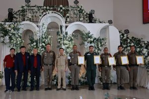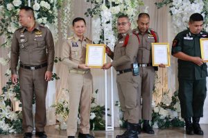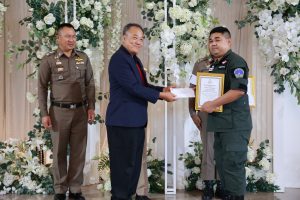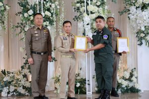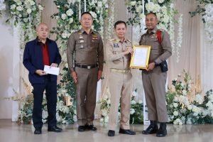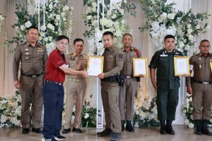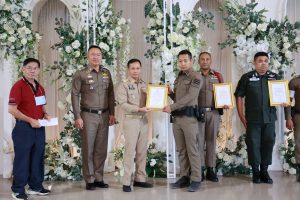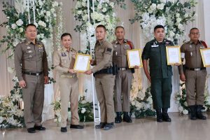 ต่อมา นายศุภมิตร ชิณศรี ผู้ว่าราชการจังหวัดสมุทรปราการ เป็นประธานในพิธีมอบประกาศเกียรติคุณ และเงินรางวัลให้กับข้าราชการตำรวจที่มีผลงานการปฎิบัติงานดีเด่น จำนวน 5 นาย ดังนี้ พ.ต.ท.โสธร ทองสังข์ สว.จร.สภ.บางแก้ว แก้ไขปัญหาการจราจรบริเวณหน้าห้างสรรพสินค้าเมกาบางนา 2.พ.ต.ท.เจริญชัย หายทุกข์ สว.นปพ.ภ.จว.สมุทรปราการ จับกุมยาบ้าจำนวน 361,800 เม็ด 3.พ.ต.ท.แมน เมืองอินทร์ สว.จร.สภ.สำโรงใต้ แก้ไขปัญการจราจรโดยการบูรราการ การทำงานร่วมกันกับหน่วยงานภาคีเครือข่ายในพื้นที่ได้เป็นอย่างดี 4.ส.ต.ท.ตฤณ ทรงการุณย์ ผบ.หมู่ ป.สภ.สาขลา และ ส.ต.ต.พิพัฒน์ ธรรมไข ผบ.หมู่ ป.สภ.สาขลา ผลงานระงับเหตุ สกัดการหลบหนีของคนร้ายที่ก่อเหตุปล้นร้านทองสำเร็จ เมื่อวันที่ 24 พฤษภาคม 2566 ทั้งนี้เพื่อเป็นขวัญกำลังใจในการปฎิบัติหน้าที่และเป็นแบบอย่างที่ดีต่อไป