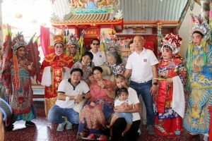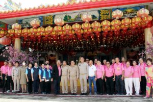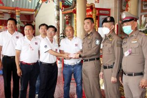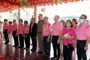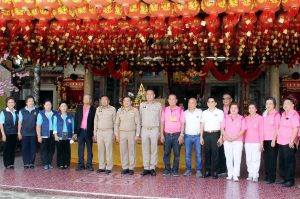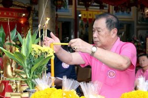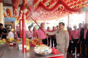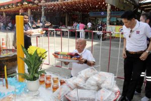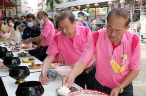 จากนั้น พล.ต.ต.ดร.พัลลภ แอร่มหล้า ผบก.ภ.จว.สมุทรปราการ จุดเทียน ธูป ถวายเครื่อง สักการะแด่องค์หลวงปู่ไต้ฮงกง และเทพเจ้าทุกพระองค์ และเป็นประธานตัดริบบิ้นเปิดโรงทาน ให้บริการอาหาร คาวหวาน และน้ำดื่ม แก่ผู้ที่มาร่วมงาน รัประทานฟรีกัน รวมกว่า 30 ซุ้ม โดยบรรยากาศภายในงานคณะงิ้ว ยังได้มาอวยพรให้กับ ครอบครับจิรยาภากร คหบดีผู้ใจบุญ บริจาคเงินให้กับทางมูลนิธิมาตลอด ต่อมาเวลา 11.00 น.นายศุภมิตร ชิณศรี ผู้ว่าราชการจังหวัดสมุทรปราการ ได้มอบหมายให้นายสุพจน์ จรูญพงศ์ รองผู้ว่าราชการจังหวัดสมุทรปราการ เป็นประธาน จุดเทียน ธูป สักการะหลวงปู่ไต้ฮงกง พร้อมด้วย นายสุจินต์ วาจากิจ รองผู้ว่าราชการจังหวัดสมุทรปราการ นายสมศักดิ์ แก้วเสนา นายอำเภอเมืองสมุทรปราการ “เฮียเอี๋ยว”สุดใจ จิรยาภากร ประธานที่ปรึกษา กต.ตร.จังหวัดสมุทรปราการ ตลอดจน คณะกรรมการเหล่ากาชาดจังหวัดสมุทรปราการ คณะกรรมแม่บ้านมหาดไทย คณะกรรมการมูลนิธิร่วมกุศล สมุทรปราการ ร่วมกันมอบข้าวสารตัวอย่าง ให้แก่ผู้สูงอายุ จำนวน 20 คน ก่อนนายศุภมิตร ชิณศรี ผู้ว่าราชการจังหวัดสมุทรปราการ และนางสาวอรวรรณ ชิณศรี นายกเหล่ากาชาดจังหวัดสมุทรปราการ เดินทางมาร่วมงาน มอบข้าวสารตัวอย่าง ให้แก่ผู้สูงอายุ อีกจำนวน 20 คน ก่อนประกอบพิธีทางศาสนาโดนพระสงฆ์จีน