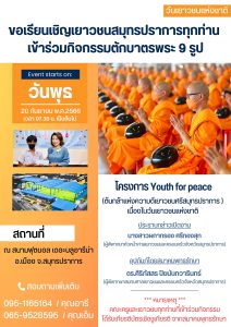 สมาคมพุทธรักษา จัดโครงการ Youth for peace (ต้นกล้าแห่งความดีเยาวชนศรีสมุทรปราการ) กิจกรรมทำบุญตักบาตรพระสงฆ์ 9 รูป เนื่องในวันเยาวชนแห่งชาติ วันพุทธที่ 20 กันยายน 2566 ตั้งแต่เวลา 07.30 น.เป็นต้นไป ณ สนามฟุตบอลหญ้าเทียม เดอะบูลอารีน่า ถนนพุทธรักษา ตำบลท้ายบ้านใหม่ อำเภอเมือง จังหวัดสมุทรปราการ