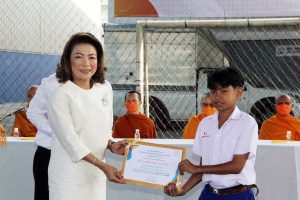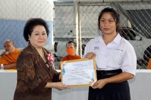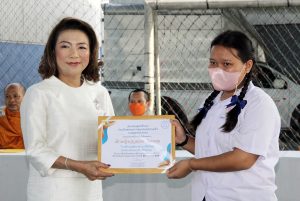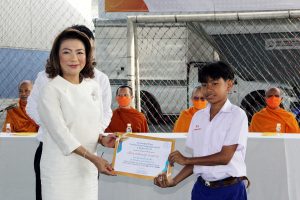 จากนั้น พระเดชพระคุณหลวงพ่อพระครูภาวนาสมณคุณ (เจ้าอาวาสวัดชัยมงคล เจ้าคณะตำบลท้ายบ้าน) ได้มอบเกียรติบัตร ให้กับนางสาวผกากรอง ศรีทองสุก ผู้พิพากษาหัวหน้าศาลเยาวชนและครอบครัวจังหวัดสมุทรปราการ และ ดร.ศิริภัสสร ปิยนันทวารินทร์ ผู้พิพากษาสมทบศาลเยาวชนและครอบครัวจังหวัดสมุทรปราการ ฐานะผู้สนับสนุนงานด้านศีลธรรมสู่เยาวชน ก่อนร่วมกันมอบเกียรติบัตร ให้กับ ผู้บริหารสถานศึกษาต้นแบบด้านศีลธรรม ครูต้นแบบด้านศีลธรรม และเด็กนักเรียนต้นแบบด้านศีลธรรม จากนั้นนางสาวผกากรอง ศรีทองสุก และ ดร.ศิริภัสสร ปิยนันทวารินทร์ ร่วมกันกล่าวคำถวายจตุปัจจัยเครื่องไทยธรรม แด่พระสงฆ์ พระเดชพระคุณหลวงพ่อพระครูภาวนาสมณคุณ (เจ้าอาวาสวัดชัยมงคล เจ้าคณะตำบลท้ายบ้าน) นำคณะสงฆ์ 9 รูป จากวัดชันมงคล เดินบิณฑบาต ข้าวสาร อาหารแห้ง เนื่องในวันเยาวชนแห่งชาติ 20 กันยายน 2566